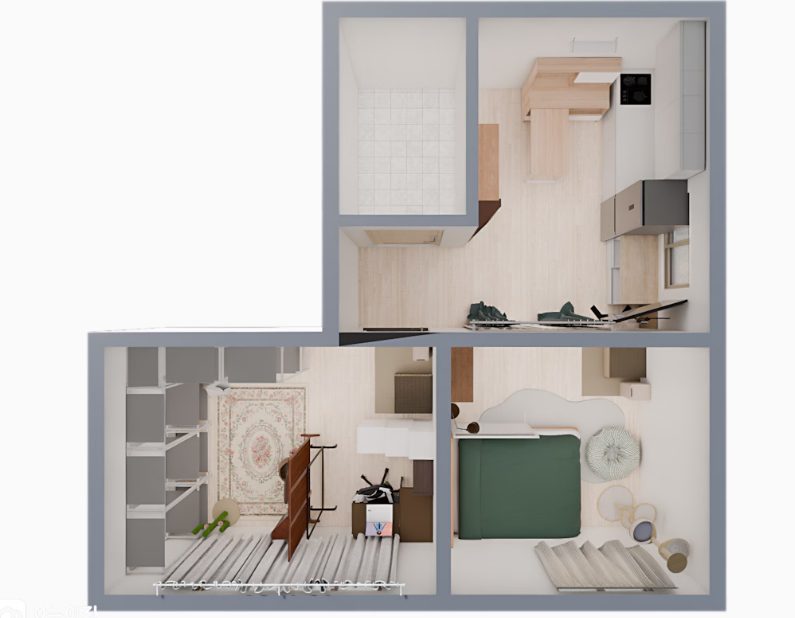 상단 3D 모드를 누르면 사람이 직접 집 안을 걷는 듯한 시점으로 공간을 확인할 수 있어, 동선이 괜찮은지, 가구 간 여유가 충분한지 한눈에 파악할 수 있습니다.